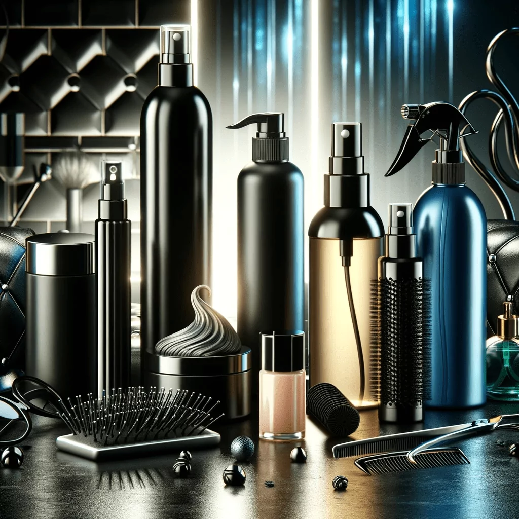 A selection of top hair styling products, including hair sprays, gels, mousses, and pomades, displayed in a modern and fashionable setting. The image emphasizes the effectiveness and versatility of these products in creating diverse and perfect hairstyles, appealing to individuals passionate about hair styling and fashion trends.