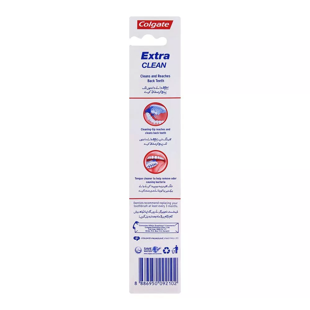 Elevate your oral care routine with the Colgate Extra Clean Medium Toothbrush. Precision-engineered with medium bristles, this toothbrush adeptly balances thorough cleaning while ensuring comfort, effectively removing plaque and surface stains. The strategically designed head ensures easy access to those hard-to-reach areas, promoting an all-encompassing clean. Additionally, the built-in tongue cleaner works diligently to rid your mouth of odor-causing bacteria, offering an all-rounded oral hygiene solution. Its ergonomic handle ensures a firm grip, optimizing brushing effectiveness. With Colgate Extra Clean Medium Toothbrush, you’re not just brushing; you’re indulging in a trusted oral care experience backed by the legacy of Colgate.