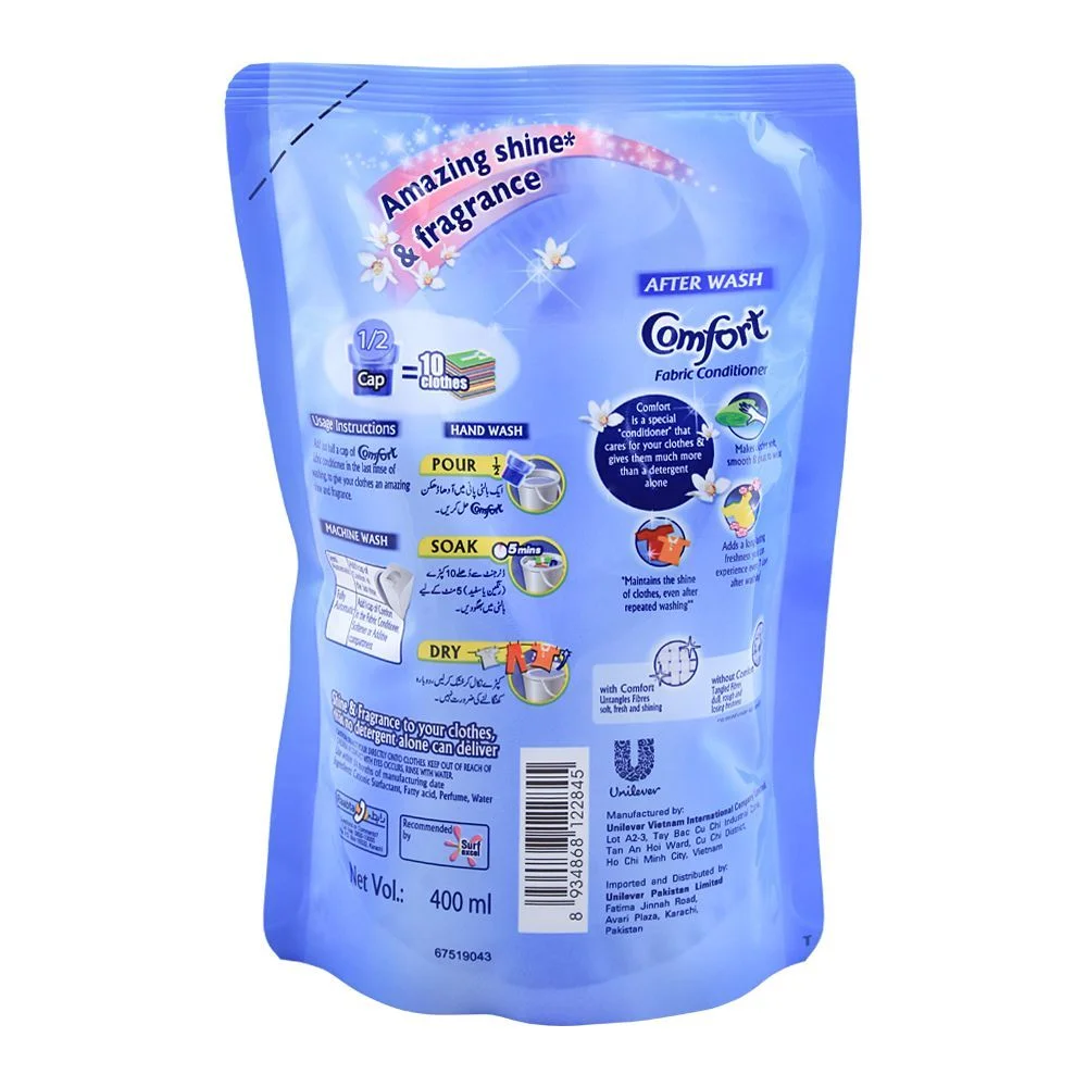 With Comfort Morning Fresh Fabric Conditioner in a 400ml pouch, Catch n Pack Pakistan offers a burst of early morning vitality for your clothes. This fabric conditioner not only imparts a refreshing fragrance but also softens fibers, making your garments a pleasure to wear. The convenient pouch is environmentally friendly and easy to store, while the formula ensures your ironing is hassle-free, and your clothes are protected wash after wash. Add Comfort Morning Fresh to your laundry for an effortlessly fresh and cozy feel, keeping your wardrobe in optimal condition. Discover the joy of laundry that smells like the freshness of a new day, now at Catch n Pack Pakistan.