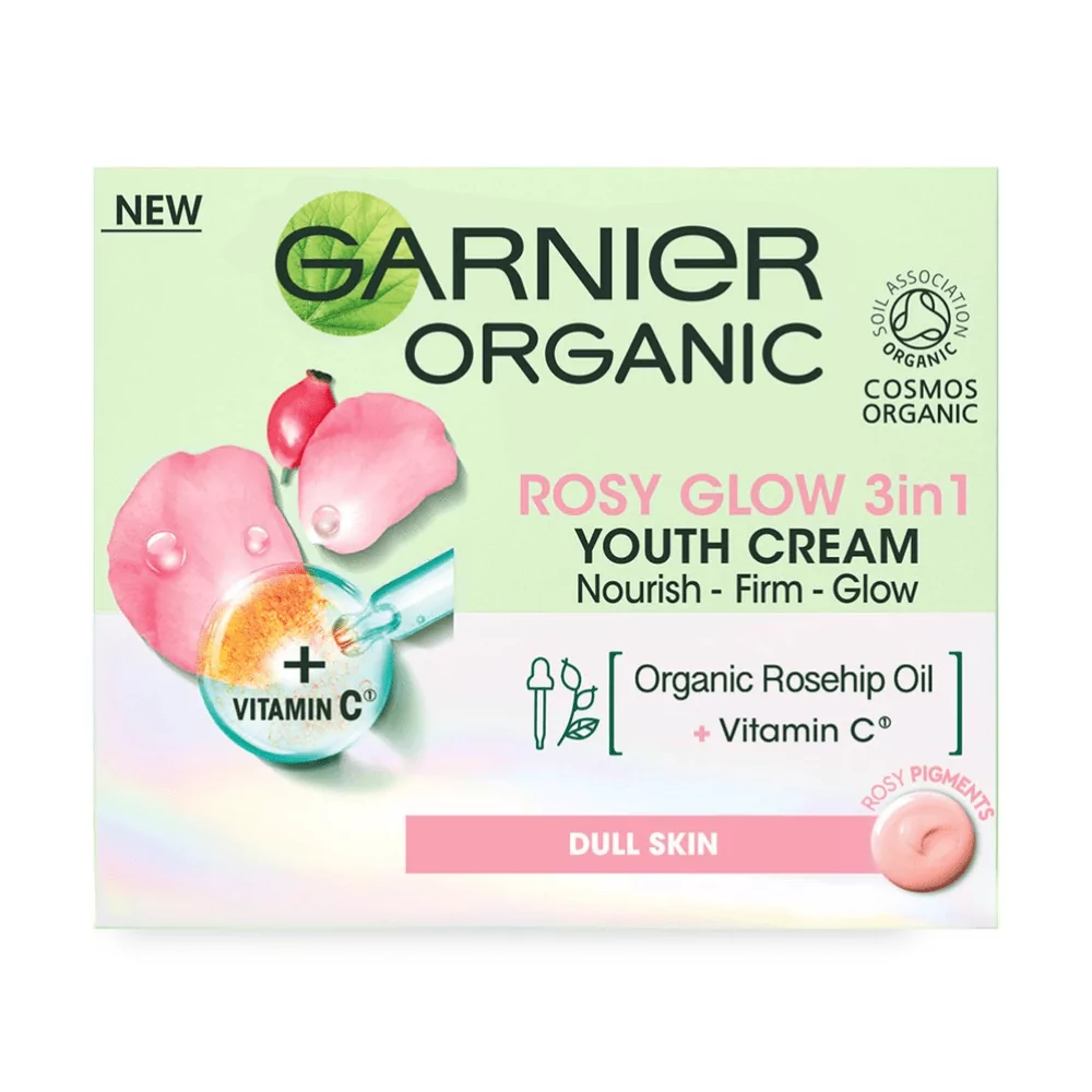 Want smooth, radiant, and youthful skin? Garnier Organic Rosy Glow 3-in-1 Youth Cream is specially formulated to nourish and brighten dull, tired skin. Enriched with Organic Rosehip Oil, known for its rich fatty acids, and Vitamin C, this cream helps to improve skin texture and restore a healthy glow.