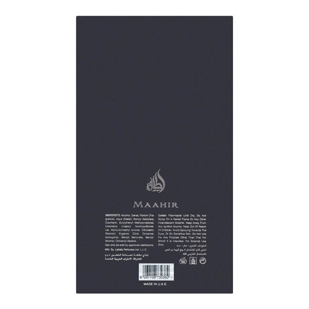 Versatile Elegance: Lattafa Maahir is versatile enough for any setting, complementing any outfit and occasion with its timeless aroma.