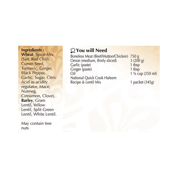 Mix – 15 g National Foods Quick Cook Haleem Spice Mix is a blend of traditional spices used in preparing haleem. It gives that unique aroma and flavor to the dish. This spice mix contains cumin, coriander, chili powder, cardamom, black pepper, cinnamon, and other ingredients. All you need to do is add some water to make a paste and then add this paste while cooking the haleem recipe. This mix can also be used for other dishes like biryani or pulao rice recipes as well.