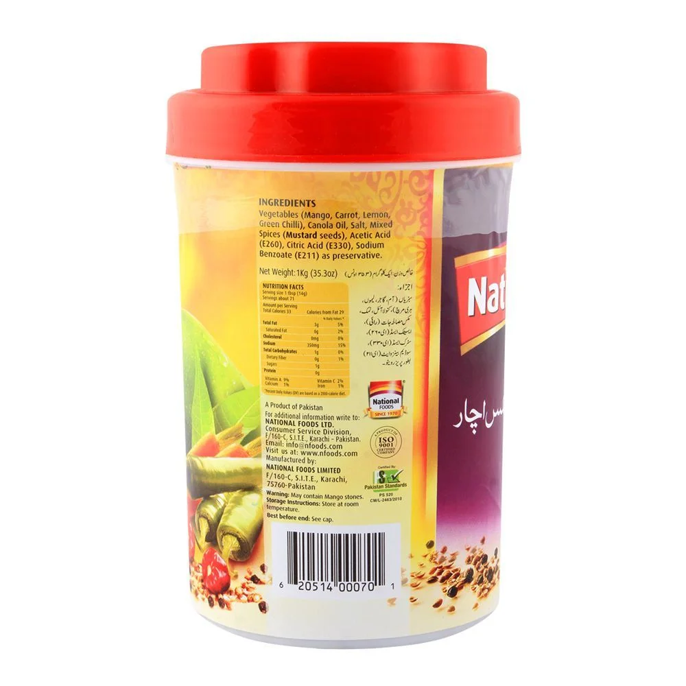 A Rich Tapestry of Flavors: National Mixed Pickle in a 1 kg jar offers a sumptuous feast for the taste buds. This blend of mixed vegetables and aromatic spices captures the essence of traditional South Asian pickling art. Every spoonful is a journey through rich, spicy, and tangy flavors.