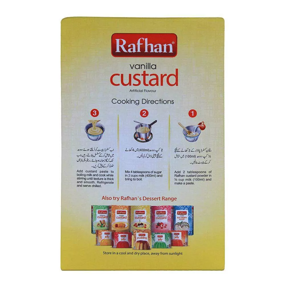 Rafhan Vanilla Custard is a delicious treat that should be tried by everyone. It’s made of Rafhan’s classic vanilla custard, a carefully-crafted combination of the finest ingredients that creates a smooth and creamy taste. The Rafhan Vanilla Custard has no added preservatives or any artificial sweeteners but uses only natural products. With its delightful flavor, Rafhan Vanilla Custard can be enjoyed as a filling in between pastry layers or sprinkled over hot desserts such as apple pie; this custard also stands alone simply spooned into a bowl for an irresistible indulgence. So why not give Rafhan Classic Vanilla Custard a try? You won’t regret it!