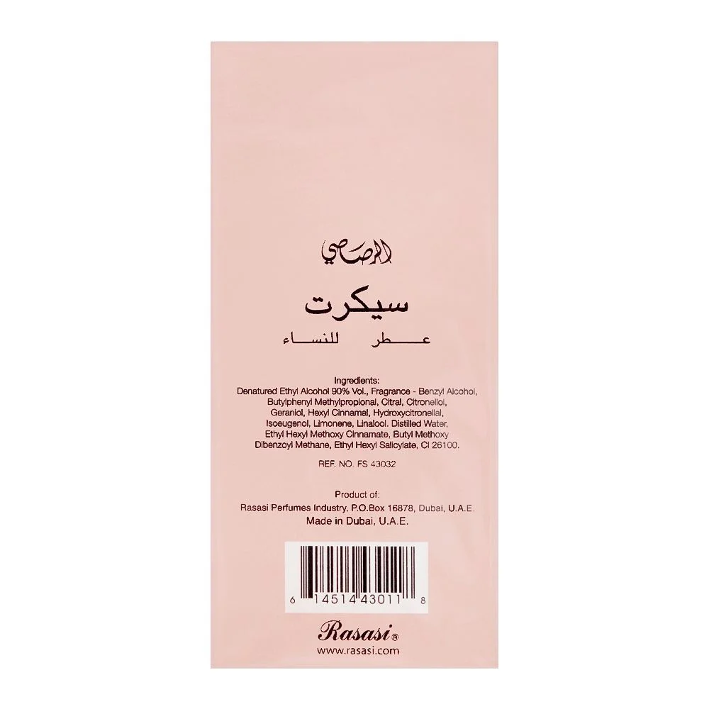 Art of Perfumery: Rasasi’s expertise in the art of perfumery ensures that Secret Pour Femme is a masterpiece, a fragrance that speaks volumes without saying a word.